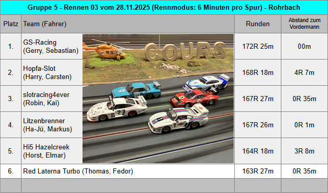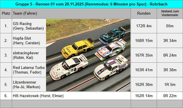 Mit den sechs Teams am heutigen Rennabend kamen insgesamt zwölf wunderschöne Gruppe 5 Fahrzeuge zum Renneinsatz. Da schlägt das Rennfahrerherz gleich mal höher. Bei der Fahrzeugabnahme gab es nur wenig Auffälligkeiten und alle Fahrzeuge entsprachen den Vorgaben aus dem Reglement. Bei einem Fahrzeug passte die Bodenfreiheit von 1,2mm hinten nur sehr knapp nicht und bei einem zweiten Fahrzeug passte die Reifenbreite hinten noch nicht ganz. Die Fahrer sind informiert und bessern das zum nächsten Rennabend nach. Für jedes Team wurden zwei Motoren ausgelost und dann jeweils in die zwei Einsatzfahrzeuge verbaut. Die Motorenliste 2026 findet man unterhalb der Teamwertung und auch für die vergangene Saison kann man die Motorenverteilung im Archiv 2025 der Gruppe 5 nachlesen. Das Qualifying musste mit dem Einsatzfahrzeug für den ersten Renndurchgang gefahren werden. Und so starteten aus der Qualifying Reihenfolge heraus GS-Racing, slotracing4ever, Hi5 Hazelcreek und Red Laterna Turbo in das erste Rennen mit sechs Minuten pro Spur. GS-Racing konnte sich nach kurzer Zeit bereits etwas von slotracing4ever nach vorn absetzen, wurde aber weiterhin gejagt. Hi5 Hazelcreek konnte den Speed aus dem Qualifying nicht so konstant umsetzen und fuhr erstmal ein schönes Rennen gegen Red Laterna Turbo. Team Litzenbrenner fuhr mit dem leider doch manchmal hoppelnden Leihwagen Ford von Kai in diesem Rennen etwas hinterher, konnte sich jedoch noch den letzten Podiumsplatz ergattern. Aus einer hinteren Position im Qualifying machte das Team Hopfa-Slot richtig Dampf und überholte im Fernduell noch das Team slotracing4ever. Spannung pur.