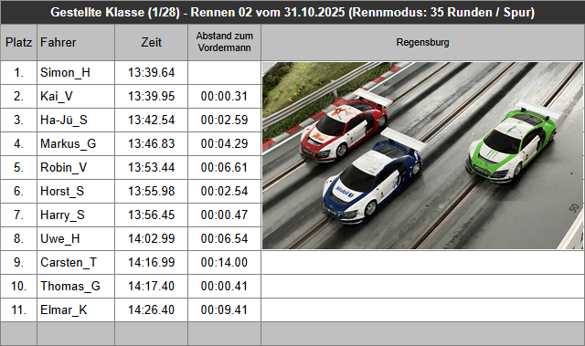 Mit frisch geschliffenen Reifen waren die Boliden der gestellten Klasse am Start. Auch hier lies das Qualifying sämtliche Möglichkeiten für einen Rennsieg für mehrere Fahrer offen. Abflugfreies Fahren war schon immer die Basis für die vorderen Plätze. Das hat Ha-Jü am besten umgesetzt und holt sich nach dem ersten Rennen gleich mal die Führung in der Fahrerwertung. Mit knappen vier Sekunden dahinter war Robin auch nicht schlecht unterwegs und Klaus setzte sich auf den dritten Platz. Ein sehr gutes Rennen ist Frank gefahren und hat sich mit dem sechsten Platz ebenfalls ein tolles Ergebnis geholt.