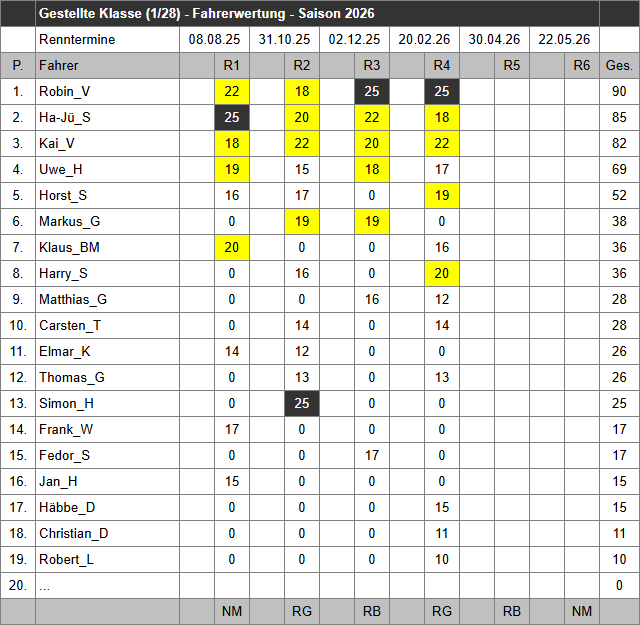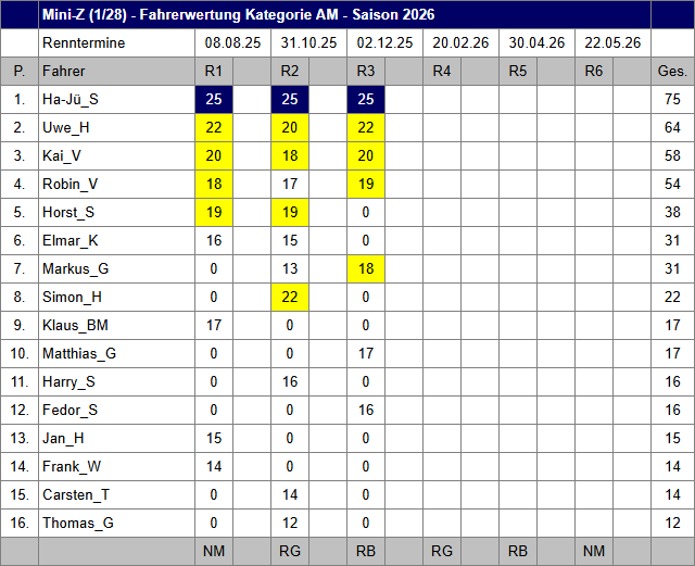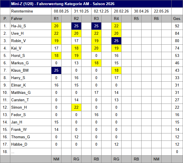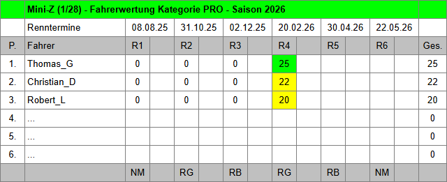 Von insgesamt jeweils 6 Rennen Mini-Z-GT PRO/AM und der gestellten Klasse kommen in der Saison 2026 vier Rennen in die Wertung.