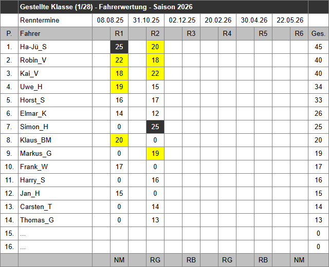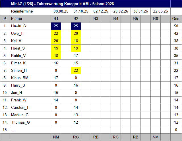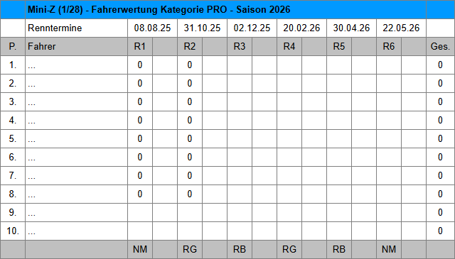 Von insgesamt jeweils 6 Rennen Mini-Z-GT PRO/AM und der gestellten Klasse kommen in der Saison 2026 vier Rennen in die Wertung.