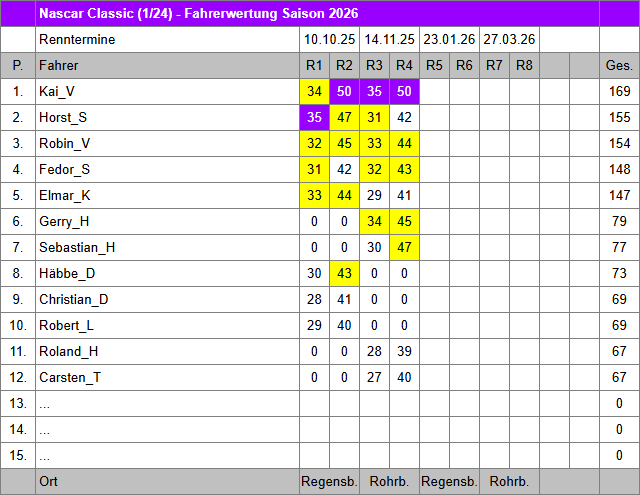 | Nascar Classic | Ergebnisse | Fahrerwertung | Reglement | ... |