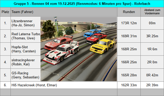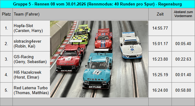 Mit den sechs Teams am heutigen Rennabend kamen insgesamt zwölf wunderschöne Gruppe 5 Fahrzeuge zum Renneinsatz. Da schlägt das Rennfahrerherz gleich mal höher. Bei der Fahrzeugabnahme gab es nur wenig Auffälligkeiten und alle Fahrzeuge entsprachen den Vorgaben aus dem Reglement. Bei einem Fahrzeug passte die Bodenfreiheit von 1,2mm hinten nur sehr knapp nicht und bei einem zweiten Fahrzeug passte die Reifenbreite hinten noch nicht ganz. Die Fahrer sind informiert und bessern das zum nächsten Rennabend nach. Für jedes Team wurden zwei Motoren ausgelost und dann jeweils in die zwei Einsatzfahrzeuge verbaut. Die Motorenliste 2026 findet man unterhalb der Teamwertung und auch für die vergangene Saison kann man die Motorenverteilung im Archiv 2025 der Gruppe 5 nachlesen. Das Qualifying musste mit dem Einsatzfahrzeug für den ersten Renndurchgang gefahren werden. Und so starteten aus der Qualifying Reihenfolge heraus GS-Racing, slotracing4ever, Hi5 Hazelcreek und Red Laterna Turbo in das erste Rennen mit sechs Minuten pro Spur. GS-Racing konnte sich nach kurzer Zeit bereits etwas von slotracing4ever nach vorn absetzen, wurde aber weiterhin gejagt. Hi5 Hazelcreek konnte den Speed aus dem Qualifying nicht so konstant umsetzen und fuhr erstmal ein schönes Rennen gegen Red Laterna Turbo. Team Litzenbrenner fuhr mit dem leider doch manchmal hoppelnden Leihwagen Ford von Kai in diesem Rennen etwas hinterher, konnte sich jedoch noch den letzten Podiumsplatz ergattern. Aus einer hinteren Position im Qualifying machte das Team Hopfa-Slot richtig Dampf und überholte im Fernduell noch das Team slotracing4ever. Spannung pur.