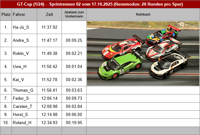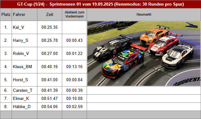 Auch wenn ich es hier als Rennleiter schreibe: Der GT-Cup hat auch in seiner mittlerweile dreizehnten Saison nicht an Reiz verloren und ist weiterhin eine Hammer Rennserie. Ein kleiner Tipp noch aus der Erfahrung der letzten Fahrzeugabnahme. Die Fahrzeuge dürfen vor dem Rennen auch gerne 216 Gramm wiegen und nicht nur knapp 215 Gramm. :-)