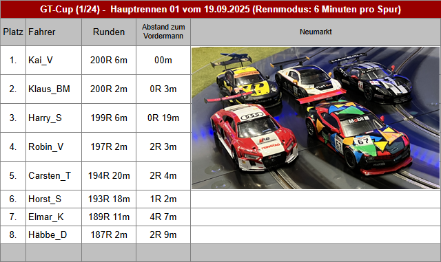 Im Hauptrennen konnte sich Carsten immer vor Horst halten und zog das auch bis zur Zieleinfahrt durch. Elmar und Häbbe fuhren ein robustes Rennen mit wenig Fehlern und am Ende konnte sich Elmar den Platz vor Häbbe ergattern. In der letzten Startgruppe starteten Robin und Harry (beide mit einem Frühstart) gegen Kai, der sich dann für eine kurze Zeit absetzen konnte. Dann extreme Aufholjagd von Harry, doch kurz vor dem Duell mit Kai ein kleiner Fahrfehler mit Abflug. Und wieder war für Kai die Führung gesichert. Klaus griff anfangs in einem Fernduell an und fuhr ähnliche Rundenzeiten wie Kai auf der jeweiligen Spur. Im letzten Durchgang ging es dann zwischen Robin, Harry und Klaus in einem Fernduell gegen Kai, der die Marke von 200 Runden bereits vorgelegt hatte. Klaus rollte drei Meter weniger weit als Kai und Harry hatte die 200er Marke nicht ganz knacken können. Ein mega spannendes Rennen.