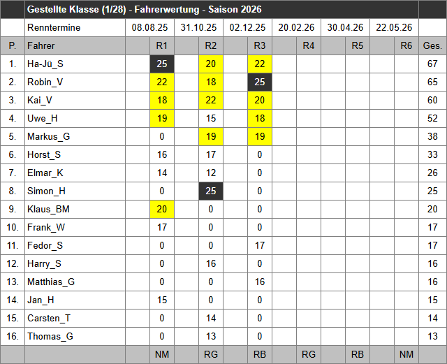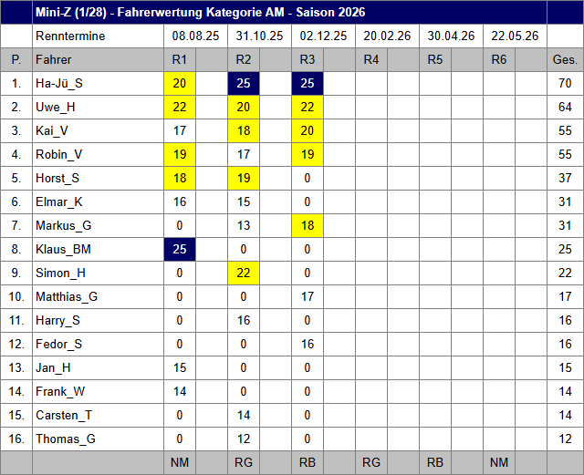 Von insgesamt jeweils 6 Rennen Mini-Z-GT PRO/AM und der gestellten Klasse kommen in der Saison 2026 vier Rennen in die Wertung.